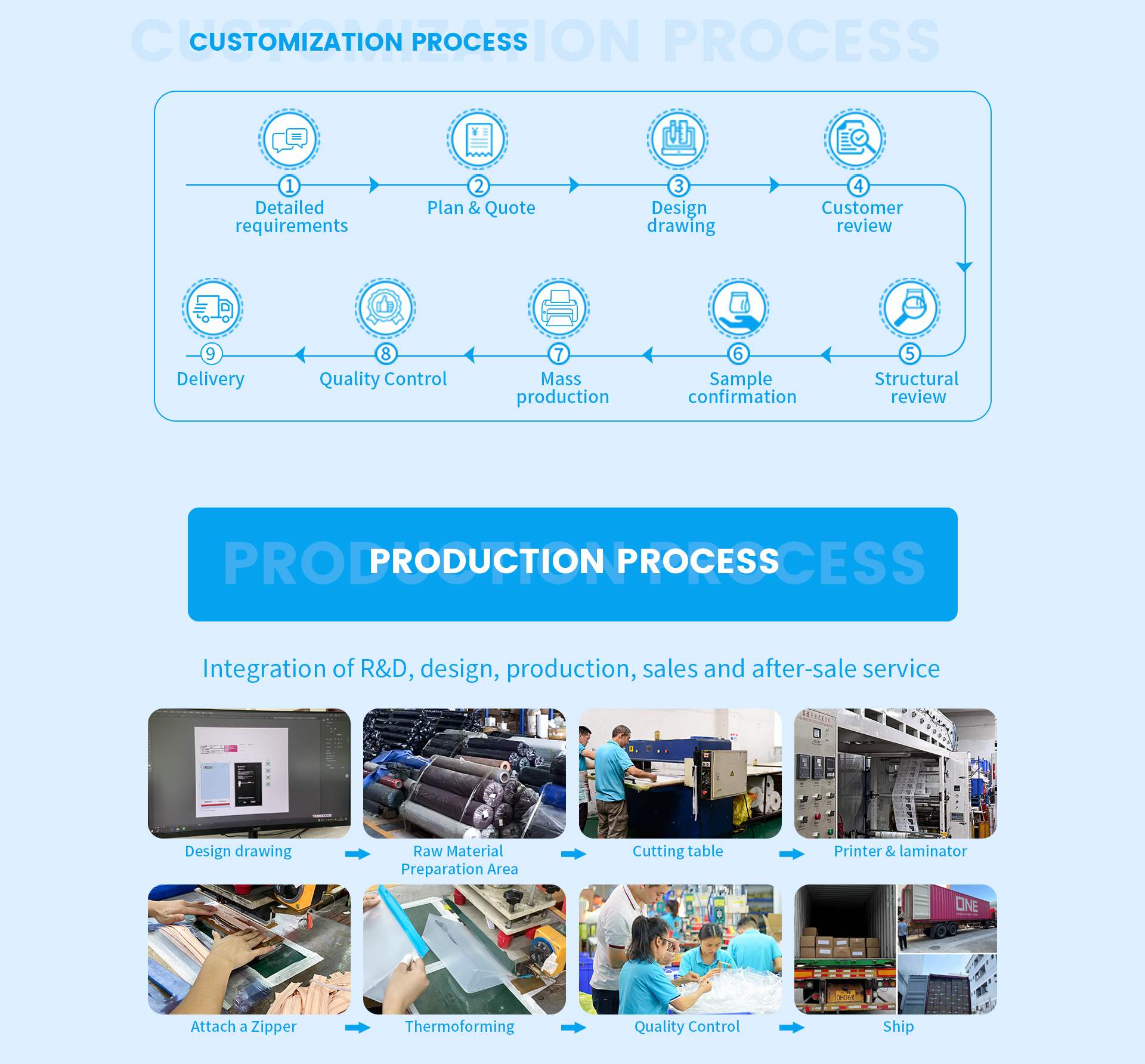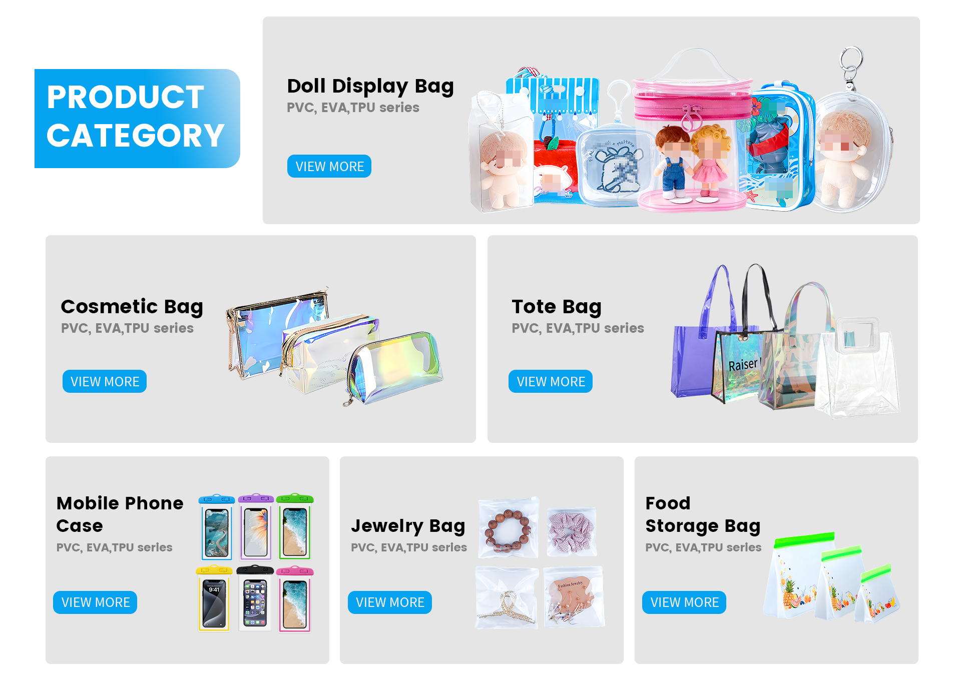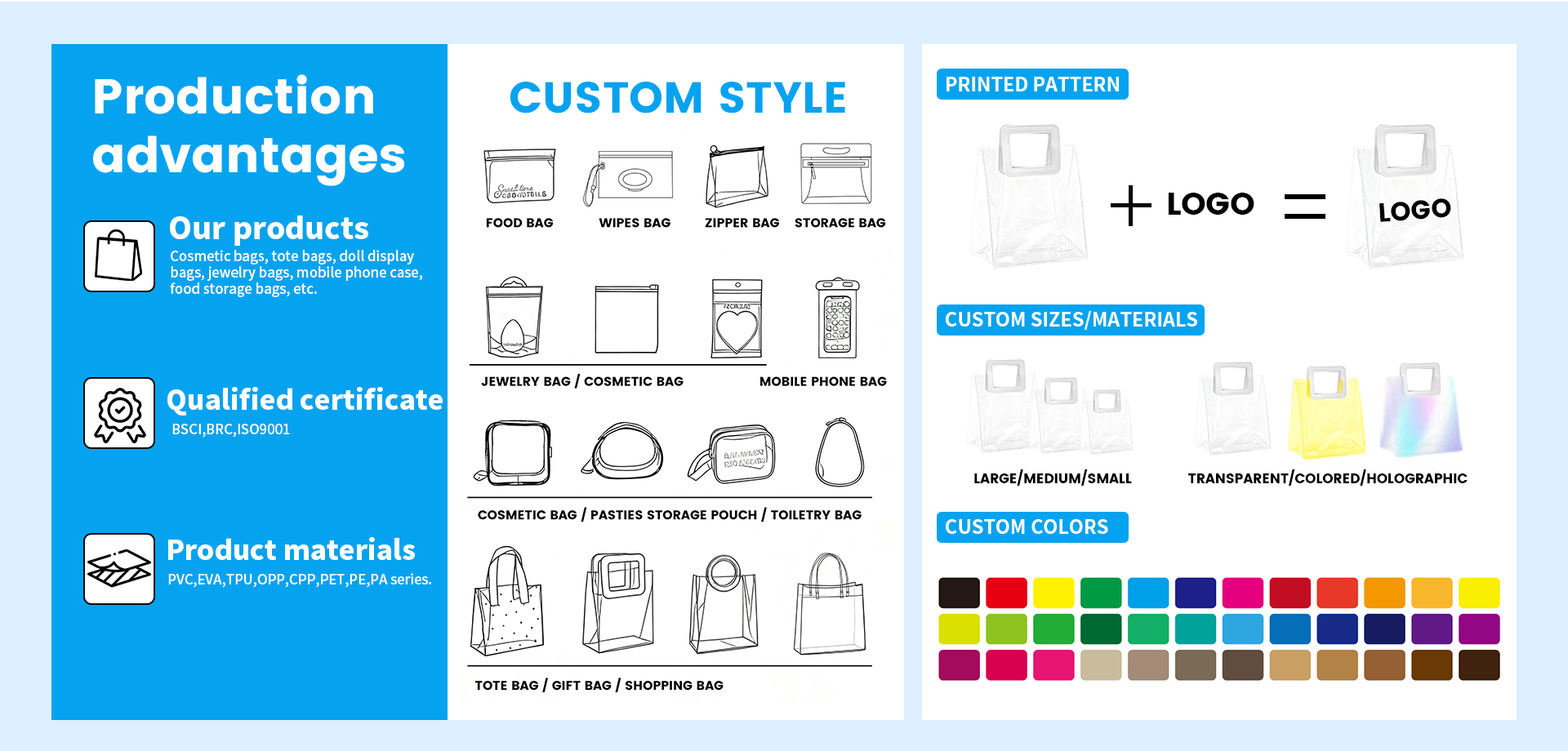 Our core strengths: Deep manufacturing expertise,This ensures strict quality control, competitive pricing, and reliable delivery. Extensive product portfolio, plastic bags:cosmetic bags, tote bags, doll display bags, jewelry bags, mobile phone case, food storage bags, etc. Materials: PVC,EVA,TPU,OPP,CPP,PET,PE,PA series.